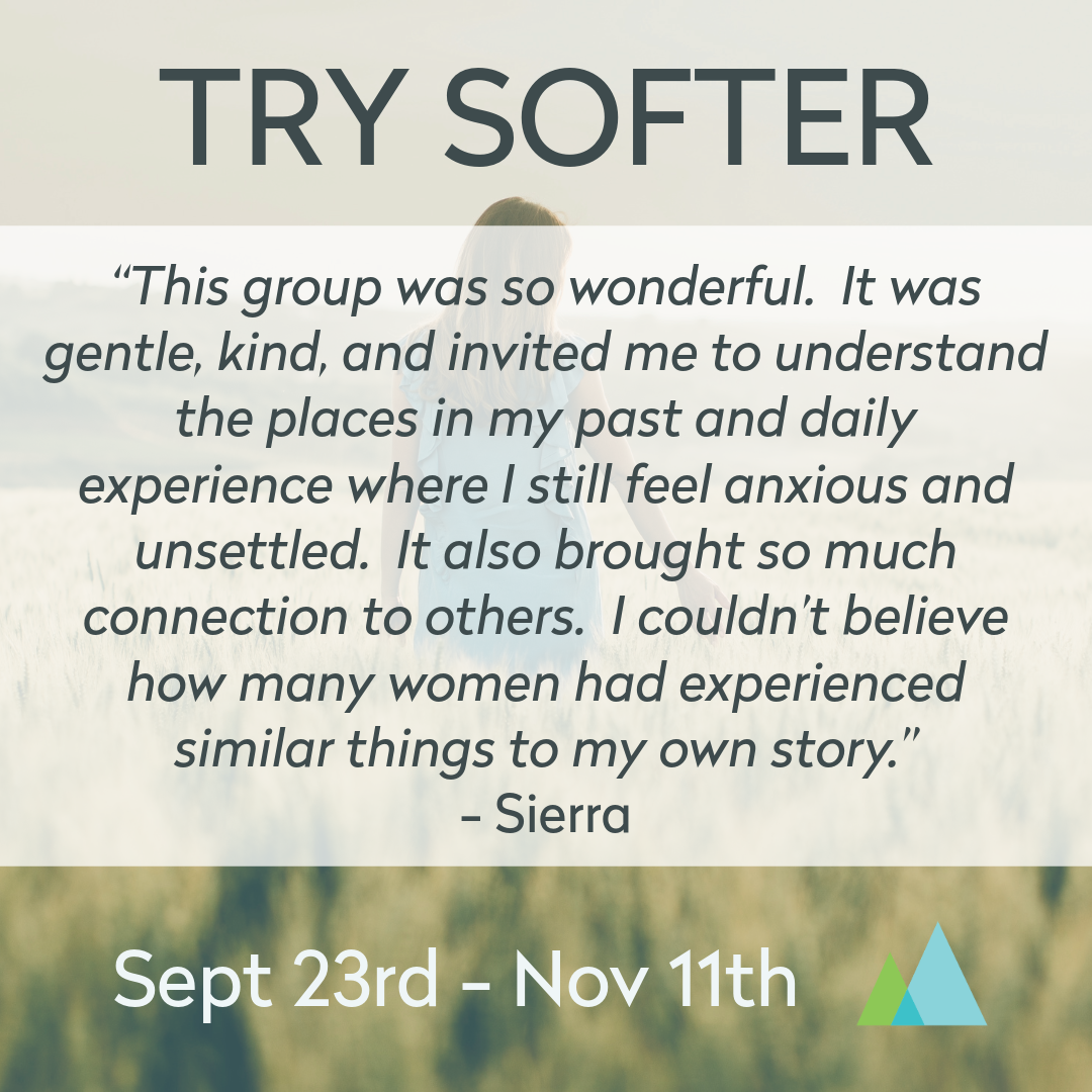 This Counseling Group is for women who have had painful life experiences, deal with ongoing feelings of anxiety or distress, and who long to walk in greater peace & compassion with their stories. Structured around the book Try Softer by Aundi Kolber, this group will provide a space to learn, process, and connect with other women.